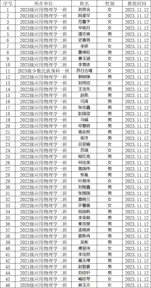 根据《内蒙古科技大学推荐优秀团员作为入党积极分子工作的实施细则》文件相关规定,经个人申报、班主任,团支书审核、团支部开展民主会议、团总支最终审核决定,拟推荐刘思含等46名同学为内蒙古科技大学理学院2023——2024年第一学期推荐优秀团员为入党积极分子,公示日期截止11月15日晚20:00。