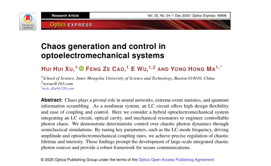 近日,物理学专业硕士研究生徐慧慧同学以第一作者身份在国际光学权威期刊《Optics Express》(中科院二区,影响因子3.3)上发表了题为“Chaos generation and control in optoelectromechanical systems”的学术论文,通讯作者为我院马永红教授。内蒙古科技大学理学院为论文唯一单位和通讯单位。《Optics Express》是Optica Publishing Group主办的光学学术期刊之一,主要发表光学与光子学所有分支领域的高水平前沿学术成果,覆盖光学材料与器件制备技术、光学成像与传感系统开发、光纤通信及光子集成电路、量子信息处理、量子测量与传感等关键领域,是国际光学界广泛认可的享有高度学术声誉的期刊之一。