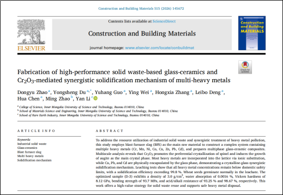 近日,《Construction and Building Materials》(中科院1区TOP期刊,JCR分区:Q1,影响因子8.0)刊发了我院硕士研究生学术论文“Fabrication of high-performance solid waste-based glass-ceramics and Cr2O3-mediated synergistic solidification mechanism of multi-heavy metals”。我院2023级物理学专业硕士研究生赵东宇为该论文第一作者,物理学硕士生导师杜永胜教授为通讯作者。该研究小组依托我院“白云鄂博矿多金属资源综合利用”平台开展相关研究。